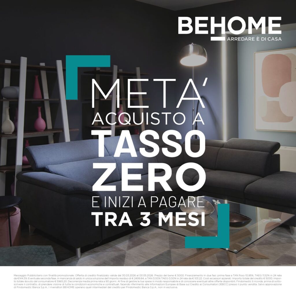 Messaggio Pubblicitario con finalità promozionale. Offerta di credito finalizzato valida dal 06.04.2026 al 03.05.2026. Prezzo del bene € 5000. Finanziamento in due fasi: prima fase a TAN fisso 10,95%, TAEG 11,52% in 24 rate da € 144,39. Eventuale seconda fase, in mancanza di saldo in unica soluzione dell’importo residuo di € 2499,84, a TAN 0,00% TAEG 0,00% in 24 rate da € 103,22. Costi accessori azzerati. Importo totale del credito € 5.000. Importo totale dovuto dal consumatore € 5965,20. Decorrenza media prima rata a 90 giorni. Al fine di gestire le tue spese in modo responsabile e di conoscere eventuali altre offerte disponibili, Findomestic ti ricorda, prima di sottoscrivere il contratto, di prendere visione di tutte le condizioni economiche e contrattuali, facendo riferimento alle Informazioni Europee di Base sul Credito ai Consumatori (IEBCC) presso il punto vendita. Salvo approvazione di Findomestic Banca S.p.A.. I rivenditori BEHOME operano quali intermediari del credito per Findomestic Banca S.p.A., non in esclusiva.